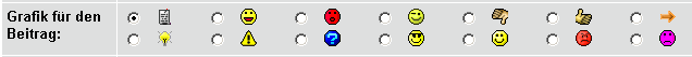 In den Brettübersichten und in der Beitragsansicht der verschiedenen Themen werden alle Beiträge mit einem kleinen Icon (auch Smiley genannt) gekennzeichnet. Dieses Icon wird vom Beitragsersteller ausgewählt, kann aber nachträglich editiert werden.